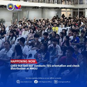 CHED UniFAST Regional Coordinators, supervised by Mrs. Catherine Chan, Education Supervisor II, conduct a Tertiary Education Subsidy (TES) orientation and distribute 1,257 checks to Mariano Marcos State University grantees in Batac City, Ilocos Norte, on October 15, 2025.