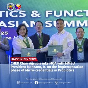 CHED Chair Agrupis inks MOA with MMSU President Manzano, Jr. on the implementation phase of Micro-credentials in Probiotics, at Teatro Ilocandia-MMSU, Batac City, Ilocos Norte