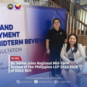 In support of the national agenda to advance inclusive growth and strengthen workforce development, Dr. Christine Nabor-Ferrer, Director IV of the Commission on Higher Education Regional Office I (CHED RO1), participated in the Regional Mid-Term Review and Consultation on the Philippine Labor and Employment Plan (LEP)