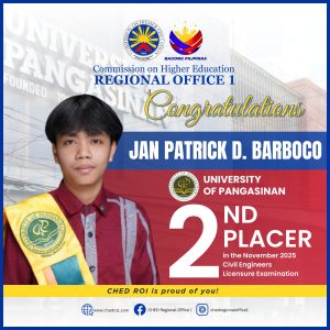 Engr. Jan Patrick D. Barboco of the University of Pangasinan ranked second with a rating of 91.65% in the November 2025 Civil Engineers Licensure Examination.