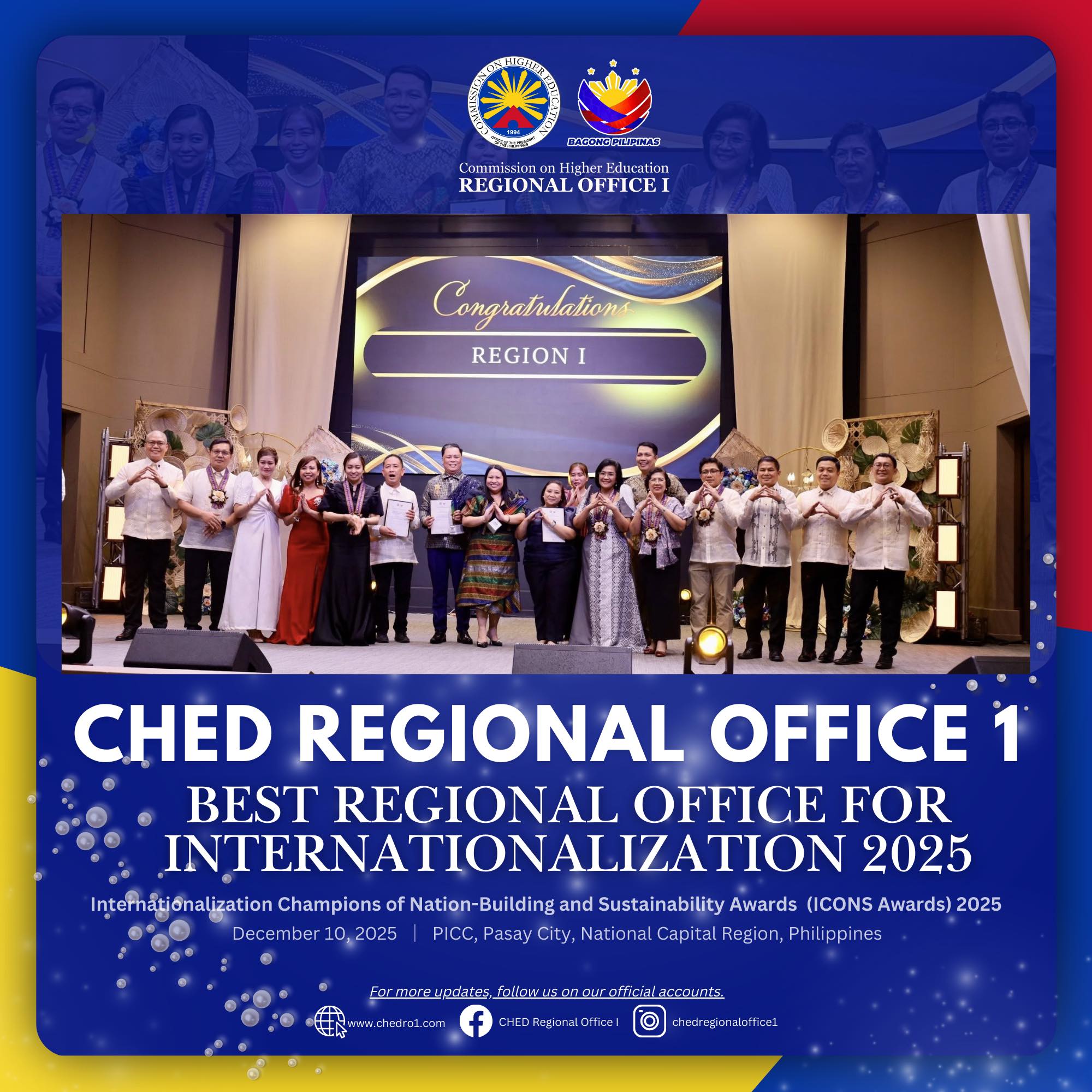 The Commission on Higher Education Region I (CHED RO1) clinched the 2025 Best Regional Office for Internationalization Award at the Internationalization Champions of Nation-Building and Sustainability (ICONS) Awards held on December 10, 2025, at the Philippine International Convention Center (PICC), Pasay City.