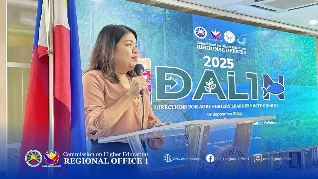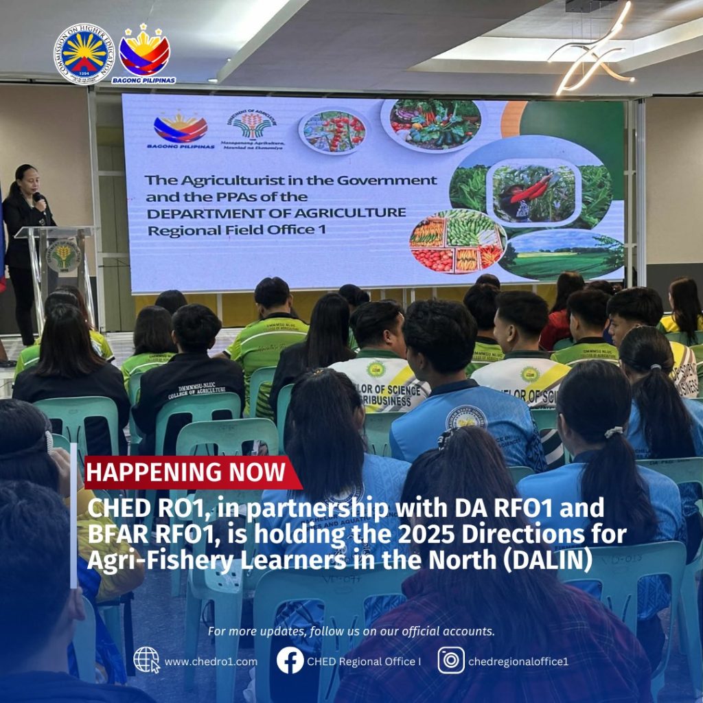 𝗛𝗔𝗣𝗣𝗘𝗡𝗜𝗡𝗚 𝗡𝗢𝗪 | The Commission on Higher Education Regional Office 1, in partnership with Department of Agriculture Regional Field Office 1 (DA RFO 1) and Bureau of Fisheries and Aquatic Resources (BFAR) Regional Office 1, is holding the 2025 Directions for Agri-Fishery Learners in the North (DALIN) at the 5F Conference Room DA Building, Aguila Rd., Sevilla, San Fernando City, La Union on September 19, 2025.