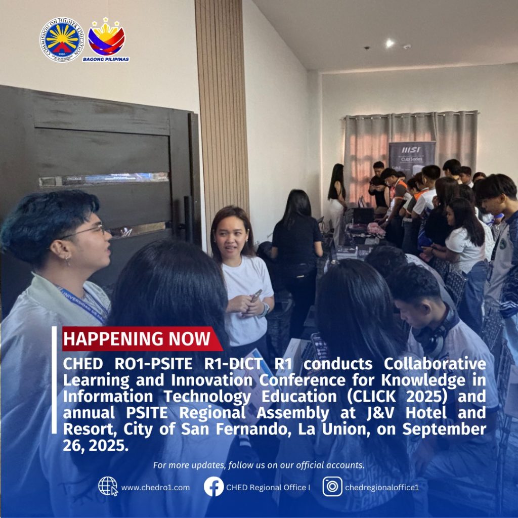CHED RO1-PSITE R1-DICT R1 conducts Collaborative Learning and Innovation Conference for Knowledge in Information Technology Education (CLICK 2025) and annual PSITE Regional Assembly at J&V Hotel and Resort, City of San Fernando, La Union, on September 26, 2025.