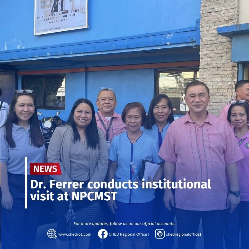 In line with the Commission on Higher Education Regional Office I’s (CHED RO1) commitment to ensure quality, accessible, relevant, and liberating higher education in the region, Dr. Christine Nabor-Ferrer, Director IV of CHED RO1, conducted an institutional visit at the Northern Philippines College for Maritime, Science and Technology (NPCMST) in the City of San Fernando, La Union, on October 7, 2025.