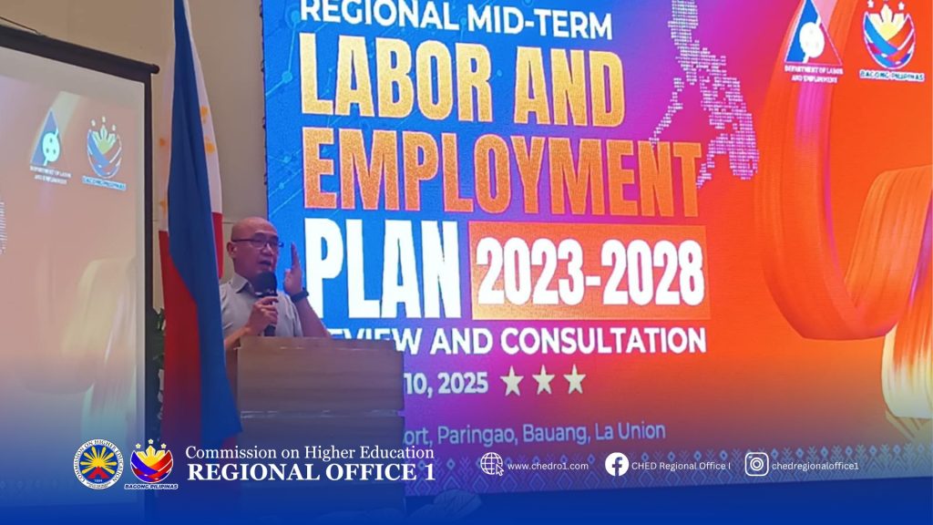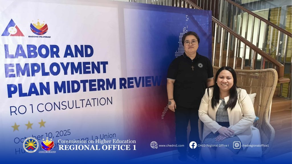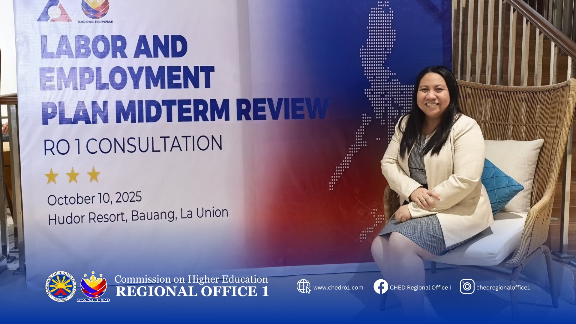 In support of the national agenda to advance inclusive growth and strengthen workforce development, Dr. Christine Nabor-Ferrer, Director IV of the Commission on Higher Education Regional Office I (CHED RO1), participated in the Regional Mid-Term Review and Consultation on the Philippine Labor and Employment Plan (LEP) 2023–2028, at Hudor Resort, Bauang, La Union on October 10, 2025.