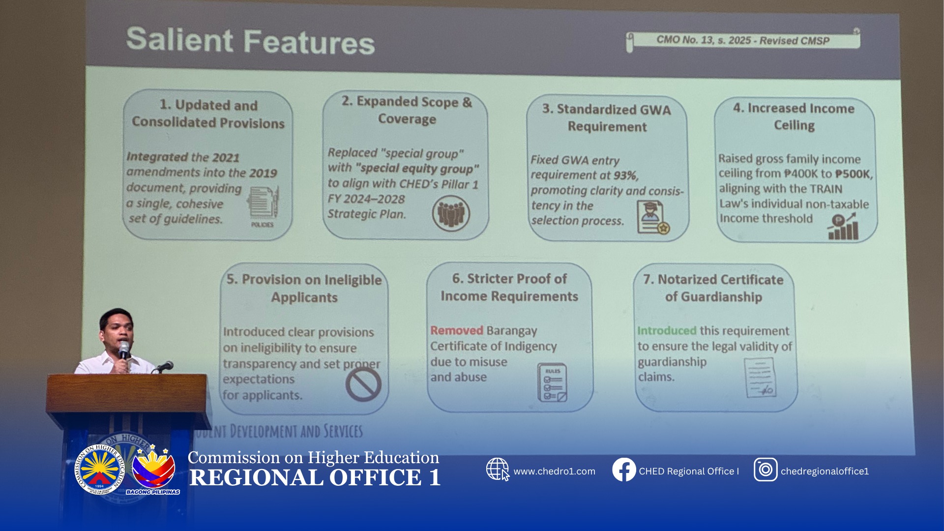 𝗛𝗔𝗣𝗣𝗘𝗡𝗜𝗡𝗚 𝗡𝗢𝗪 | Representatives from CHED Regional Office participate in the Hybrid National Orientation on the Revised Implementing Guidelines of the CHED Merit Scholarship Program (CMSP) and the CHED Scholarship Program for Future Statisticians (Estatistikolar) at the CHED Auditorium, HEDC Building, C.P. Garcia Avenue, UP Diliman, Quezon City on October 28, 2025.