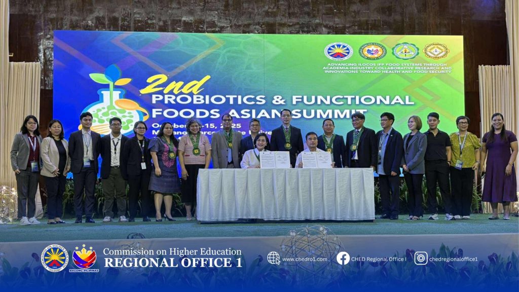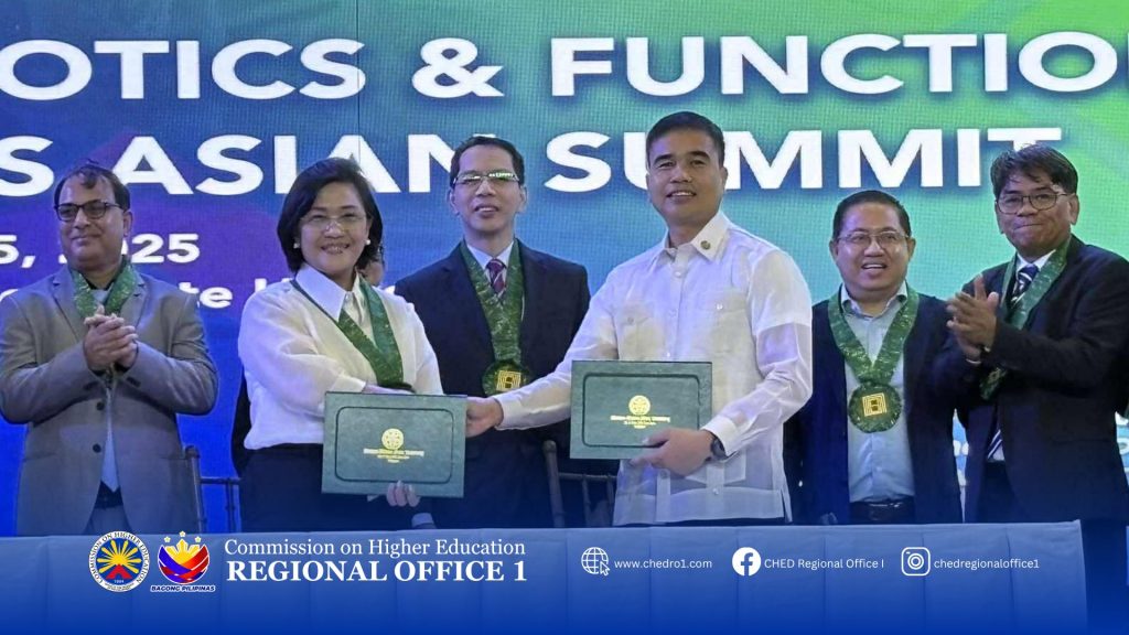CHED Chair Agrupis inks MOA with MMSU President Manzano, Jr. on the implementation phase of Micro-credentials in Probiotics, at Teatro Ilocandia-MMSU, Batac City, Ilocos Norte
